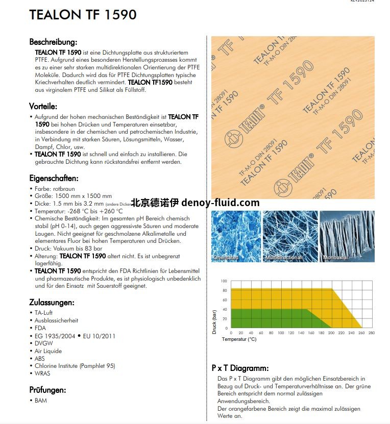 • 由于其高機(jī)械強(qiáng)度,TEALON TF 1590 可在高壓和高溫下使用,特別是在化學(xué)和石化工業(yè)中,與強(qiáng)酸、溶劑、水、蒸汽、氯等一起使用。 • TEALON TF 1590快速